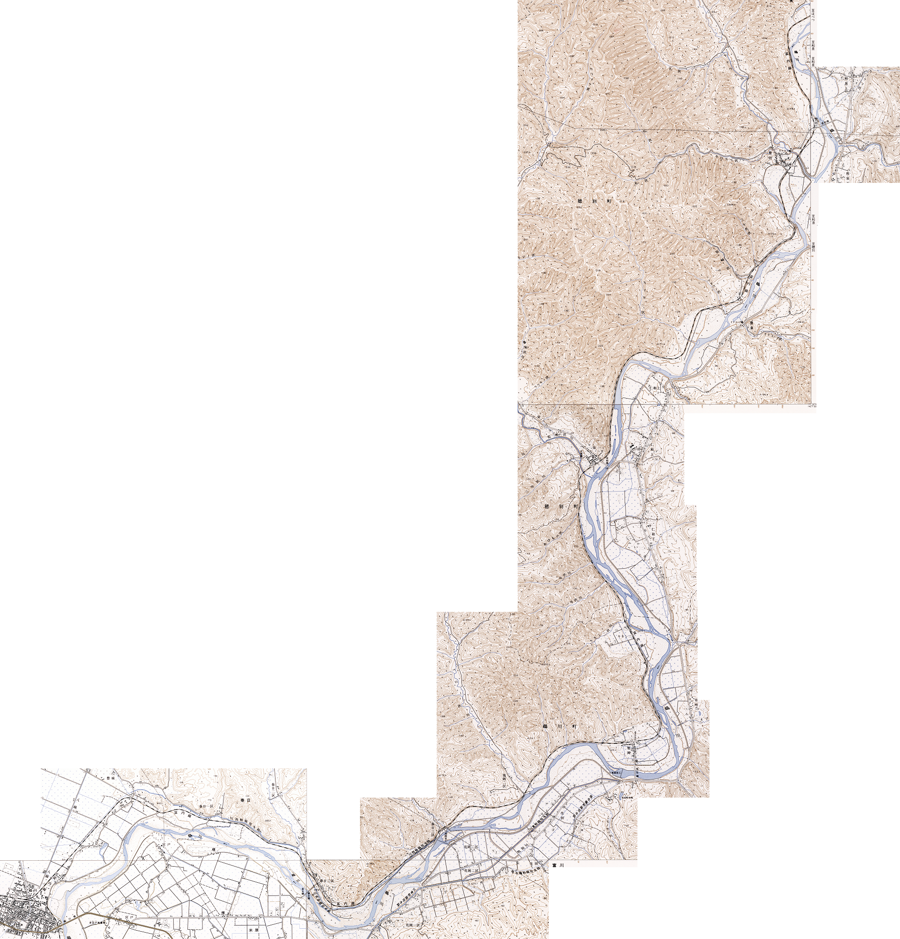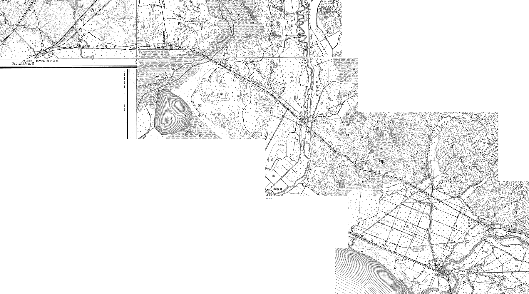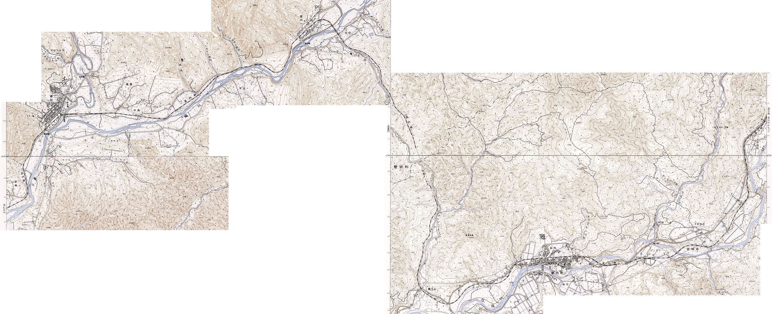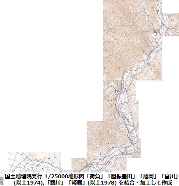 まずは(1)の区間の確認に要した計11点の1/25000地形図であるが、全ての図版をフルで扱うと途方もない大きさになるため、3つのエリアに分割した上で、この路線の構成に最小限必要な部分のみをトリミングして繋げることにより、データ量と貼り合わせ時の労力を節減した。