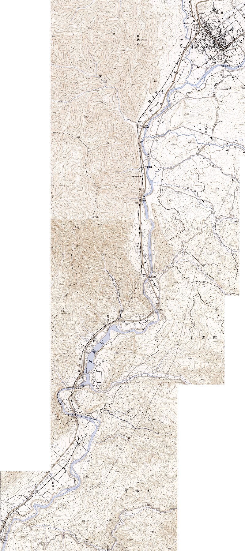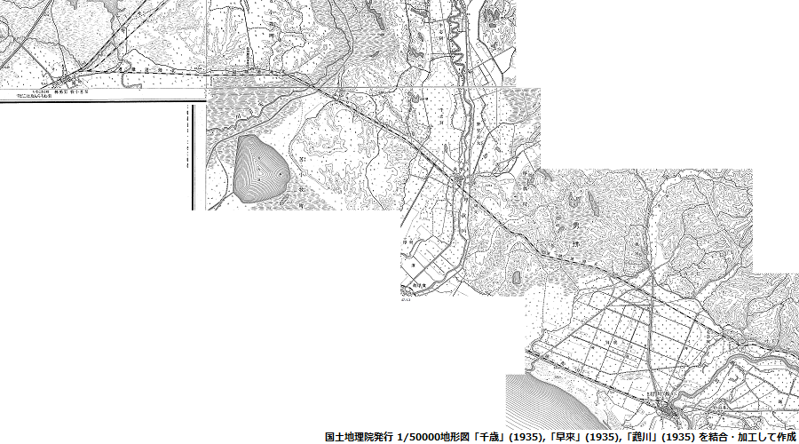 最後は(2)の区間が収められている1/50000地形図3点で、やはり路線の構成に必要な部分のみをトリミングして繋げたものだ。