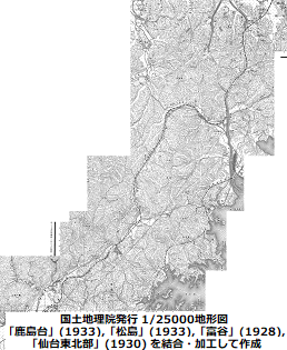 廃止区間が「鹿島台」(1933),「松島」(1933),「富谷」(1928),「仙台東北部」(1930) という計4枚にまたがっていたため、廃止区間とその周辺部分を抜き出して繋ぎ合わせたものが右の画像だ。