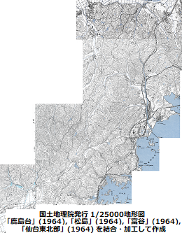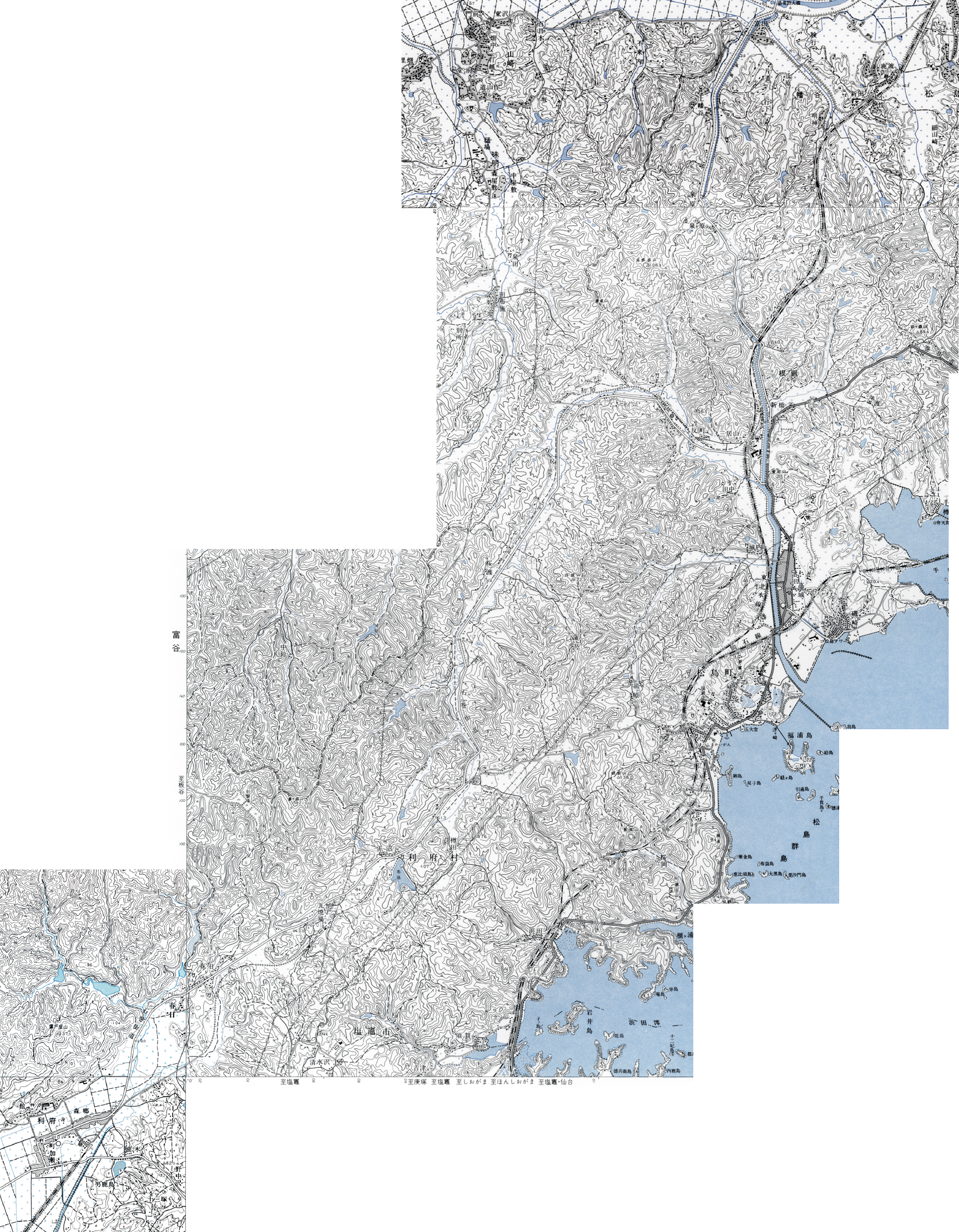 新たに入手したのは「鹿島台」(1964),「松島」(1964),「富谷」(1964),「仙台東北部」(1964) の4枚で、前図同様に廃止区間とその周辺部分を抜き出して繋ぎ合わせたものが右の画像だ。