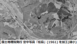 そこで公開されている空中写真から、何枚かある「松島」(1961) のうち1枚を選んだのが右の画像だ(表示用に大幅縮小したことと、クリックで少し大きな画像が見られることは、上2枚の地形図と同様)。