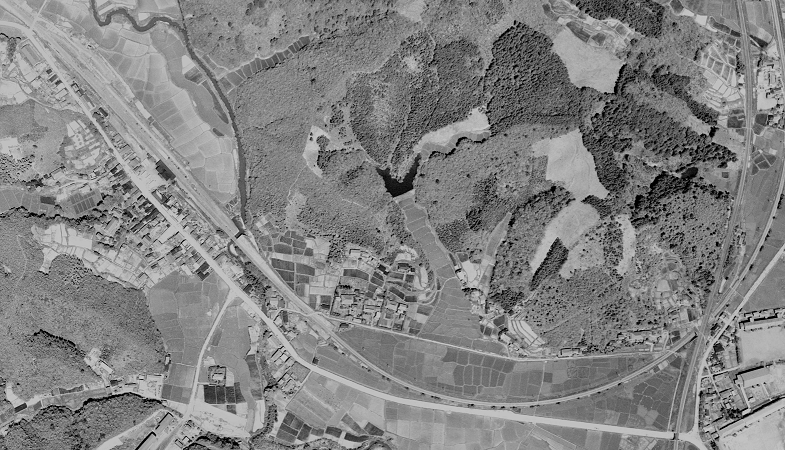 駅は画像左半分の中央やや上方にあり、縮小写真でもひときわ濃い黒色で目立っているのが駅舎である。また1930年代の地形図や後年の航空写真では分からないことだが、