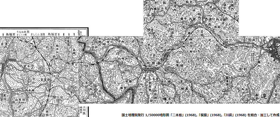 こちらは3枚にまたがっており、「二本松」(1968),「保原」(1968),「川俣」(1968) のそれぞれに川俣線が載っていたので、これを参考資料としたが、さすがに1/50000の縮尺では精度が粗すぎて、路線データ作成のメインの材料にはなり得なかった。
