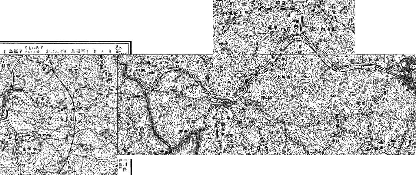 下部に示したのは、それらの地形図から、川俣線に関係する部分だけを繋ぎ合わせた画像だ。