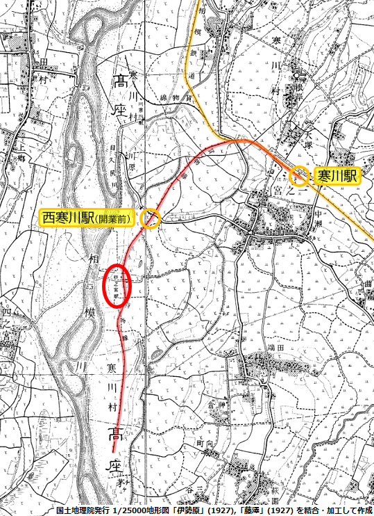 一方、赤色でハイライトしたのが、のちの西寒川支線であり、「貨物線」の文字が添えられていることからも、旅客営業を始める前であることが窺える。貨物線時代だから、まだ西寒川駅も誕生していない。