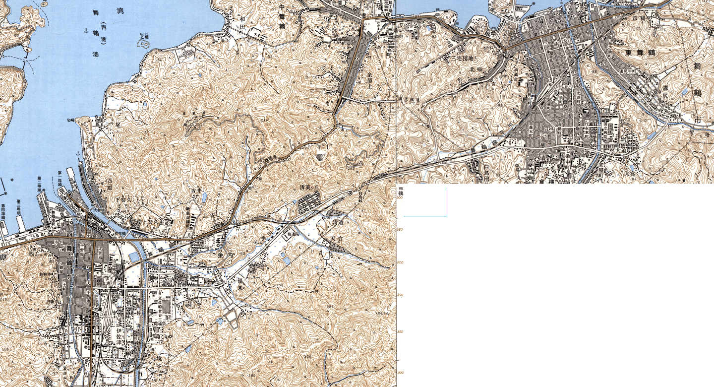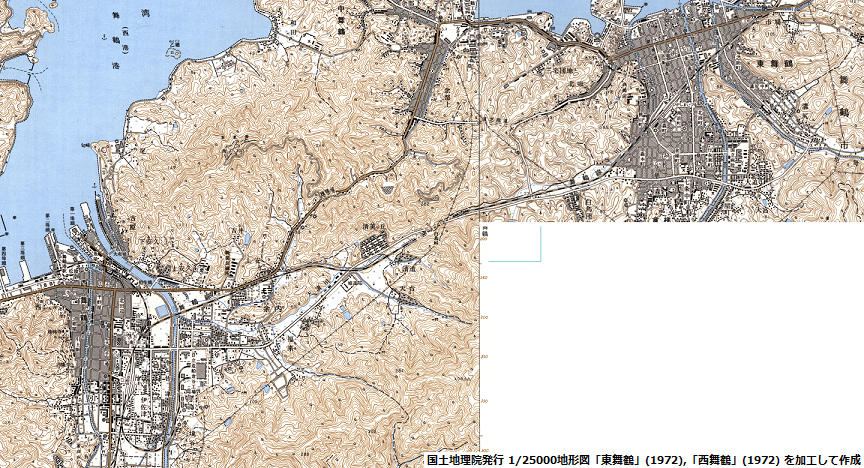 中舞鶴線については先に国交省データの線形を見ていたから、どこに線路が通っていたかは分かっていたが、1/25000地形図の「東舞鶴」(1972),「西舞鶴」(1972) を入手して改めて位置の確認を行った。