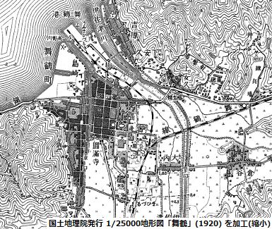 舞鶴港駅の位置を確認するには、地形図を舞鶴港線が旅客営業していた頃まで遡る必要があり、そこでさらに1/25000図の「舞鶴」(1920) を閲覧すると、果たして、そこには舞鶴港駅がしっかり記載されていた。