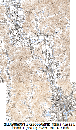 入手後、それぞれにこの路線の周囲の部分だけに絞るトリミングを行ったのち、繋ぎ合わせて1枚の地図にしたものを右に掲げている。