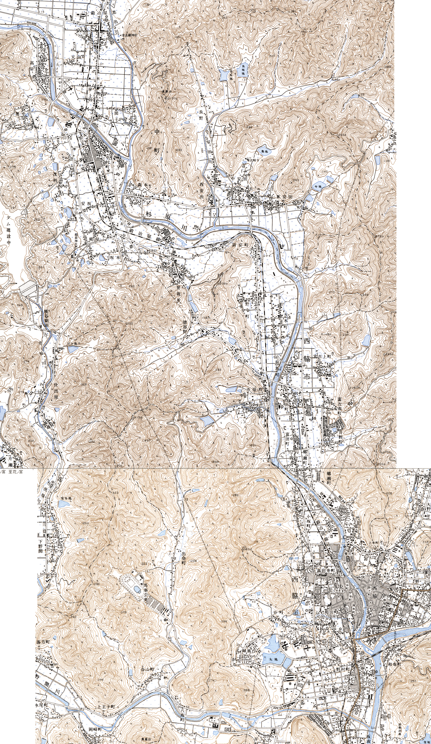1/25000の地形図では、この路線は2つの図版にまたがっており、いずれも廃止前に出版されたものの中から最も新しい年に出版されたものを選んで、