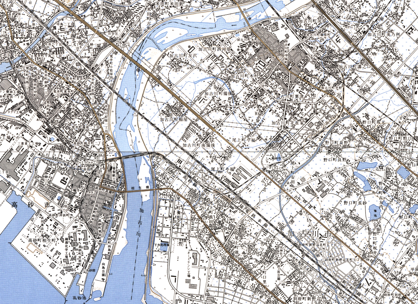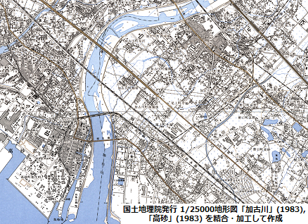 このため、ここで入手した地形図のうち「高砂」(1983) では、高砂港駅までの貨物線区間も一応含まれるようにしてトリミングを行っている。