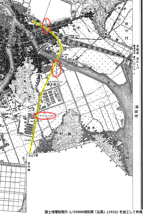 座標が決まらないとそれらの駅の位置を上のマップ内に示せないので、過去の地形図に手掛かりを求めたところ、2.5万地形図「広島」(1932) に該当する駅の多くが描かれていたことが分かった。
