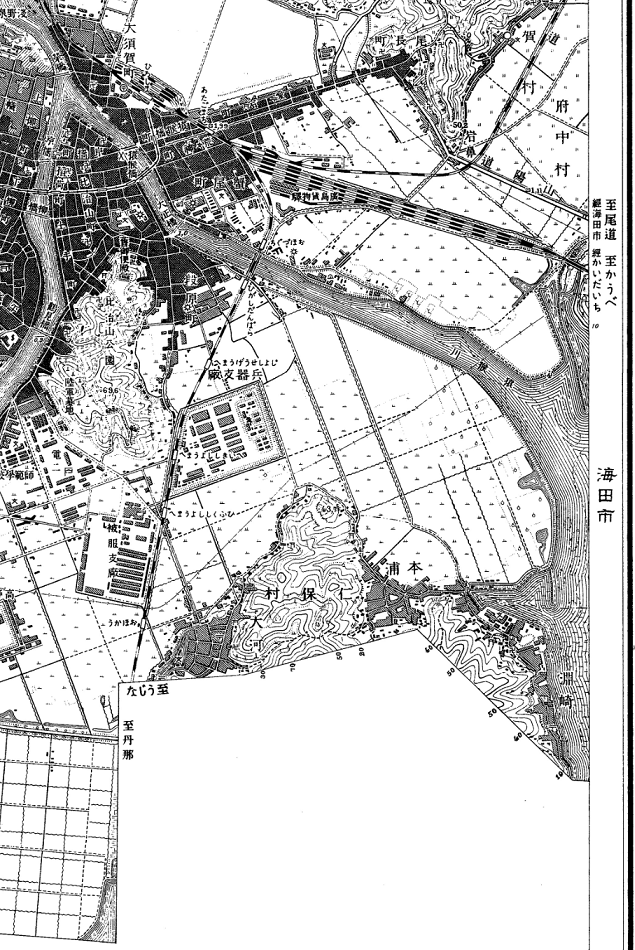 1943年に休止(実質廃止)された駅としては、さらにもうひとつ下丹那という駅が終点・宇品駅の1つ手前にあり、その位置も知りたかったのだが、何故かこの地形図は右下の一部が不自然な形状で空白となっている。