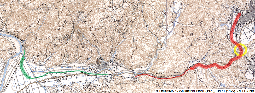 下には入手した地形図を掲げている。1/25000地形図の「大洲」(1975) と「内子」(1975) を繋ぎ合わせて、廃止される区間の周辺部だけに絞ったものだ。