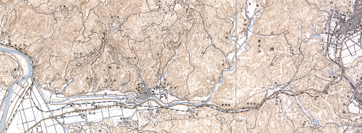 また同時に地形図の左下端ではやはり予讃線の支線が伊予大洲駅(この地形図では範囲外)-新谷駅間を新たに結んだ(※)ことで、内子線の五郎駅-新谷駅間(の一部区間)も廃止されたのだった。