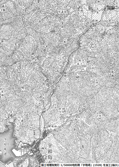 右がそれらの地形図で、デフォルトで古いほうの「宇和嶋」(1928) を表示し、画像にマウスを合わせた時に新しいほうの「宇和嶋」(1933) に表示が切り替わる。