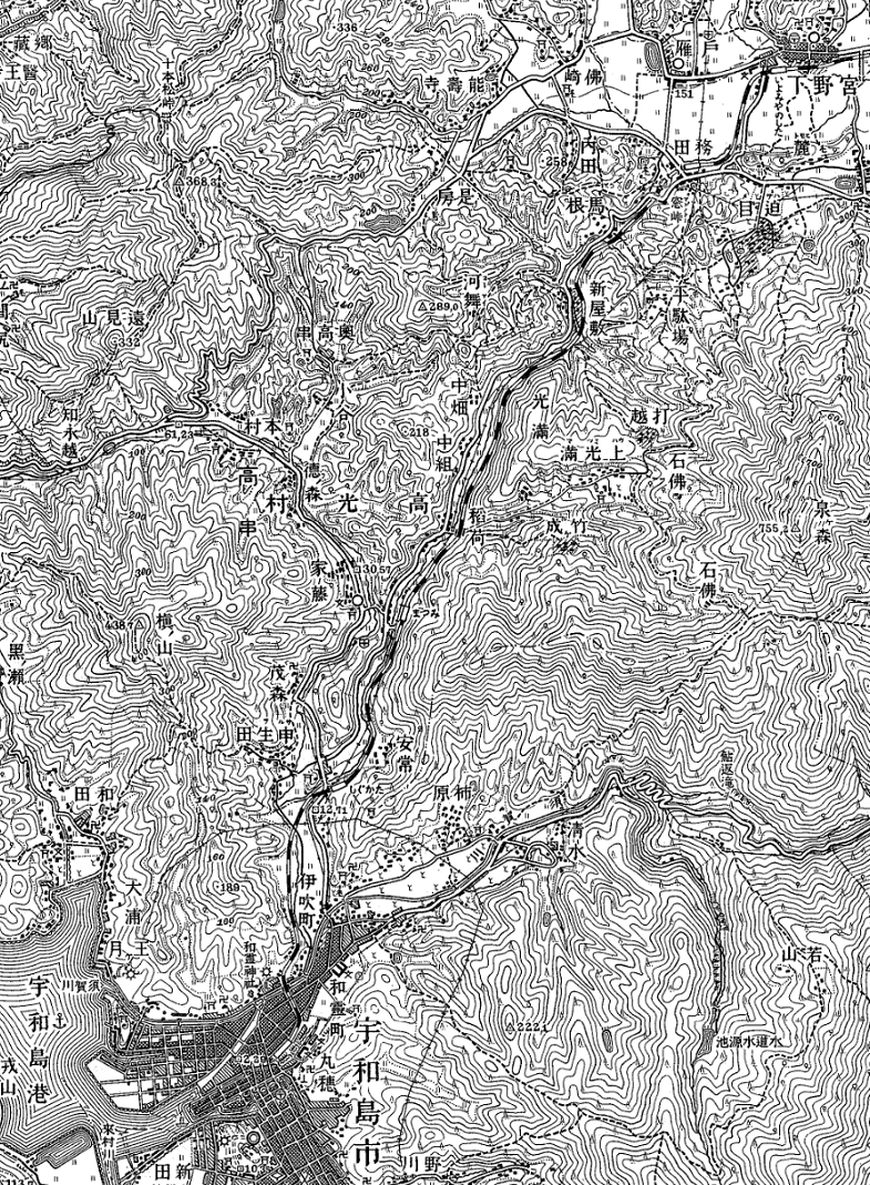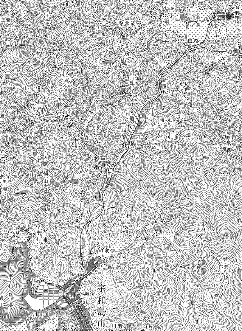 国交省のデータには、「予土線」として登録されたレコードのほか、その前身の「宇和島線」名のレコードも2件あるのだが、それらの線形は全て同一で現行線の位置を示したものでしかなく、廃止区間について知る手掛かりにはならなかった。