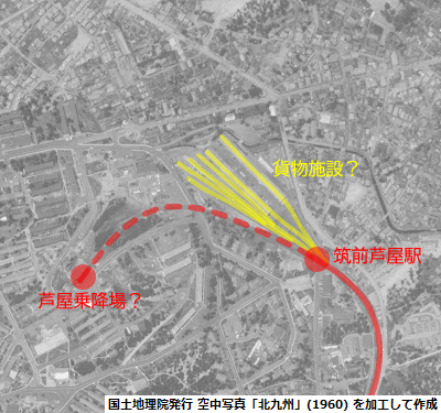 ただ、筑前芦屋駅の位置となると、きちんとした旅客乗降用のホームを持たなかったらしい(※2)だけに、航空写真のみでは見定めるのが難しいようだ。