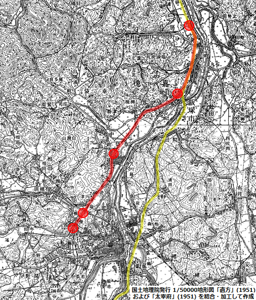 それより前の年代となると、このエリアでは1/50000縮尺の地形図しかなく、幸袋線が描かれたものとして「直方」(1951) と「太宰府」(1951) を入手している。