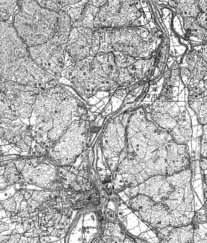 より精細な1/25000縮尺の地形図があればベストだったが、この路線のエリアで最も古い1/25000図は「直方」(1969) と「飯塚」(1969) という、廃止年にちょうど当たるものであり、内容を確認したところどちらの図版でも幸袋線の姿はすでに影も形もなかった。