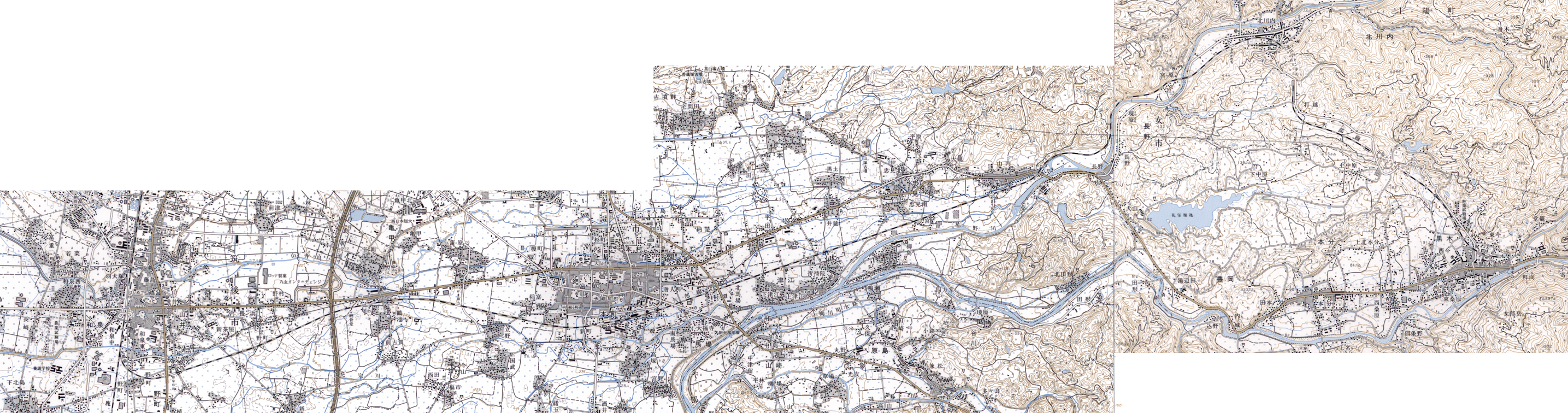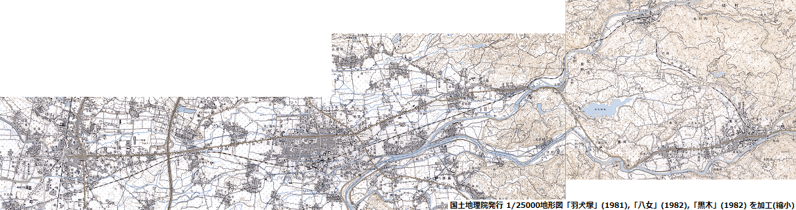 1/25000縮尺の地形図では「羽犬塚」(1981),「八女」(1982),「黒木」(1982) という3つの図版にまたがっていて、それらを繋ぎ合わせる必要があったが、