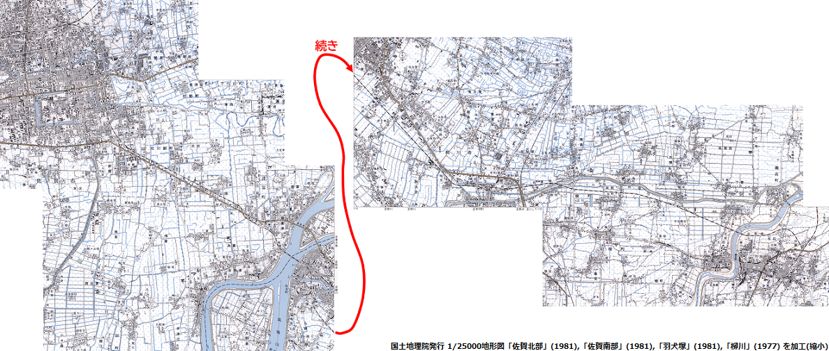 1/25000の縮尺の地形図でみると、この路線は4つの図版にまたがっていて、「佐賀北部」(1981),「佐賀南部」(1981),「羽犬塚」(1981),「柳川」(1977) という計4図を繋ぎ合わせることになった。