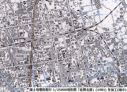 それに対して、旧駅の頃の路線の線形を確認するためにさらに入手した、1世代前の図版にあたる「佐賀北部」(1975) では、現存する構造物として旧駅や旧駅への線路が描かれているだけでなく、