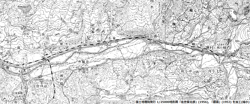 1/25000縮尺の地形図でこの路線が描かれたものとしては、「佐世保北部」(1956) と「蔵宿」(1953) が最も新しいものになるようだ。