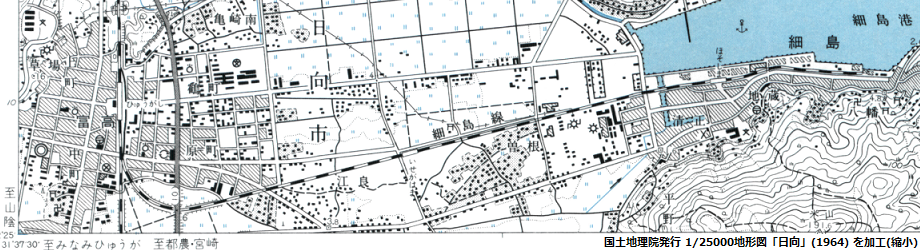 下に示すのが、その地形図から細島線の周辺部を抜き出したものだが、これなら分かっていなかった伊勢ヶ浜駅の位置も実に明解だ。