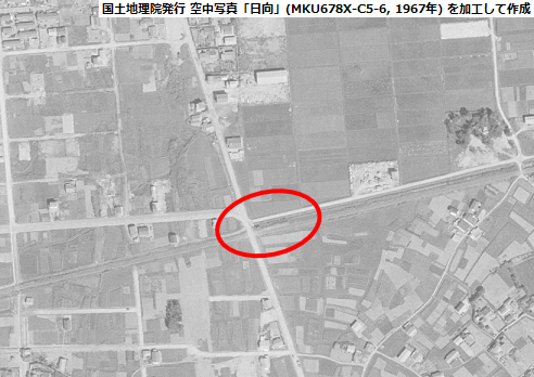 そのうち1967/09/24撮影の空中写真「日向」(写真番号:MKU678X-C5-6)で見た、この駅付近をご覧頂こう。