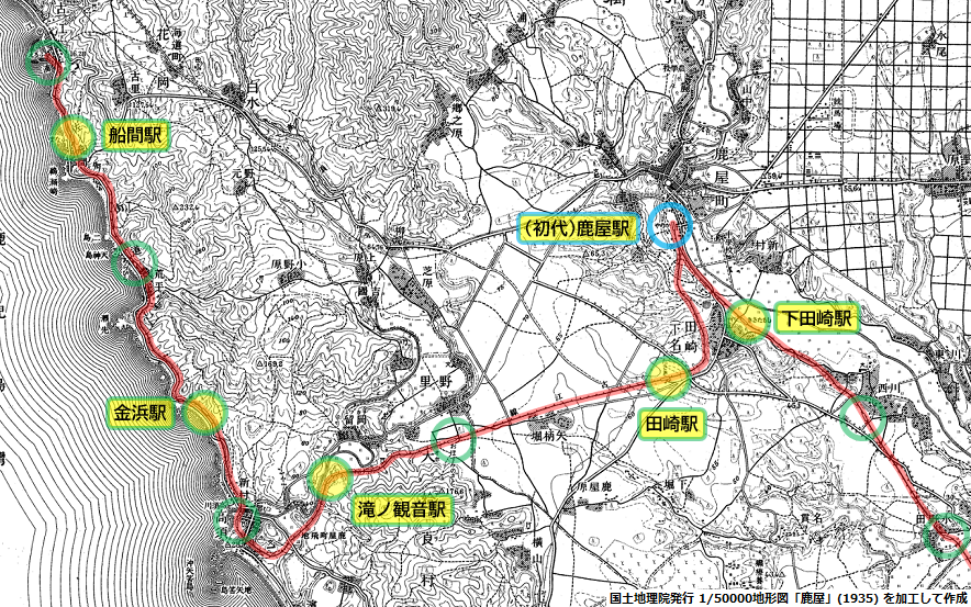 そこで過去の地形図に手掛かりを求めると、1/50000地形図「鹿屋」(1935) にこれらの駅が描かれていることが分かったので、地形図に描かれた駅記号の位置を座標化して、それを元に上のマップにも位置を示しているが、