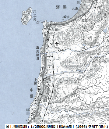 駅の移転が1972年なので、1/25000地形図「桜島南部」の1966年と1974年の版を入手して、駅の周辺を切り替えて見られるようにしたのが右の画像だ。