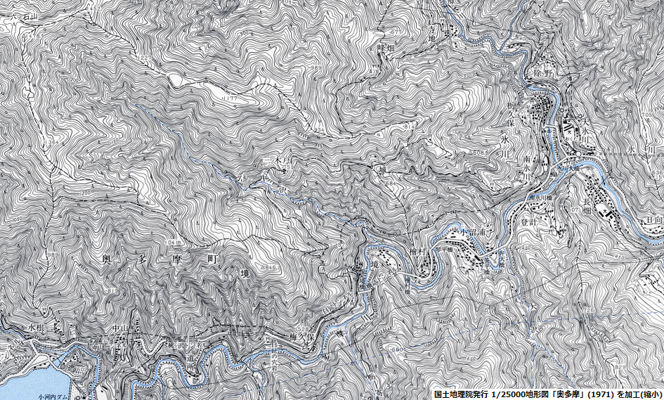 参照した1/25000地形図は 「奥多摩」(1971) で、その中から必要部分をトリミングした画像をカシミール3Dに取り込み、いくつかの三角点などを元に位置合わせを行った上で、地形図に描かれた「特殊鉄道」の記号をなぞって路線データを作成した。