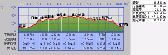 【観測地点】 降水量:0.0mm 最高気温:26.5℃ 最低気温:11.0℃ 日照時間:5.8h 〔アメダス/鳩山(埼玉県)〕 【ルート上】 基本的には晴れていたが、上空には雲も多くて、特に朝のうちは曇っている時間もそこそこあった。 陽射しが少なかったからか、朝方は少し肌寒いくらいの気温で、歩き始めてしばらくの間はフリースのベストを着用していたほど。 しかし時計の針が進むとともに気温は上がり(午後には夏日の気温に達している)、次第に山シャツの袖をまくって歩いてもそれでも汗ばむくらいにはなっていた。 雲が多かったことでスッキリとした展望は得られず、一応富士山まで見通せてはいたものの、遠くの景色はどの方角もぼんやりとした見え方にとどまった。
