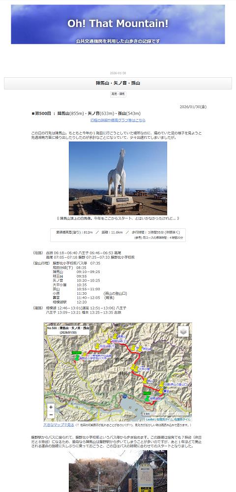 500. 2026/01/30(金) 【高尾・陣馬】 《 陣馬山(855m)・矢ノ音(633m)・孫山(543m) 》