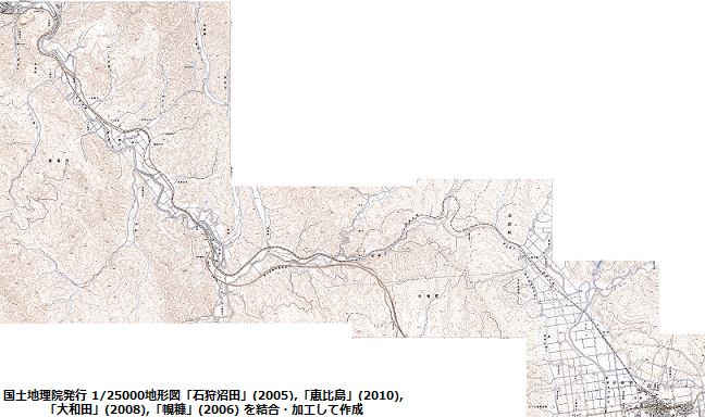 ただしこの区間は1/25000の地形図では5つの図版にまたがっており、2010年代に出版がなかったエリアがあるため、2000年代の版で揃えることにした。 留萌駅付近はのちに入手する(2)の区間と重複するため、石狩沼田-大和田間をカバーするべく、「石狩沼田」(2005),「恵比島」(2010),「大和田」(2008),「幌糠」(2006) の4図を入手したのち、この路線が描かれた区域に絞って繋ぎ合わせたものが下の左側の画像だ。 ページ内に表示するにあたり相当の縮小をかけたので、クリックすると大きめの画像が見られるようにしてあるが、 オリジナルに近いサイズのまま出す訳にもいかないので、それなりの大きさに抑えたものにはなっている。