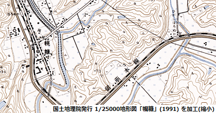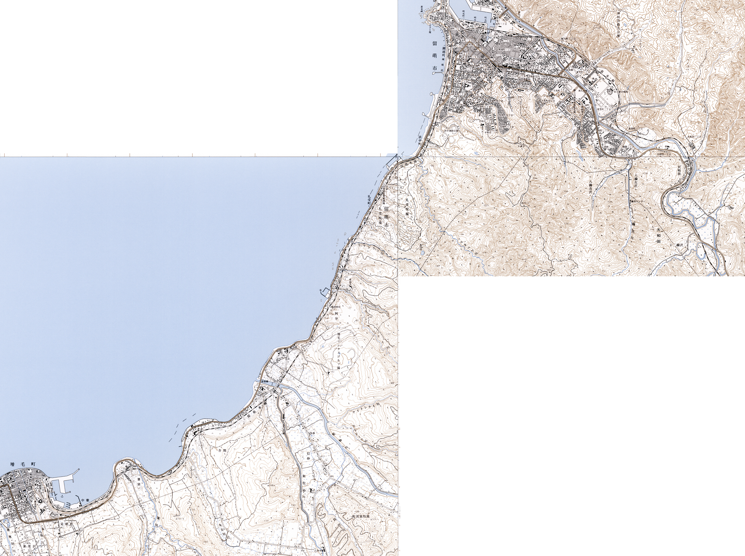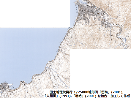 また(2)の区間(留萌-増毛間)についても、やはり1/25000の地形図では3つの図版にまたがっており、近い年代のもので揃えようとしたところ、「留萌」(2001),「大和田」(1991),「増毛」(2001) という組み合わせになった。 (1)の区間と同様に、この路線が描かれた区域に絞って繋ぎ合わせたものが下の右側の画像だ。 相当に縮小をかけており、クリックすると大きめの画像が見られるようにしてある点も(1)の区間のものと同じである。