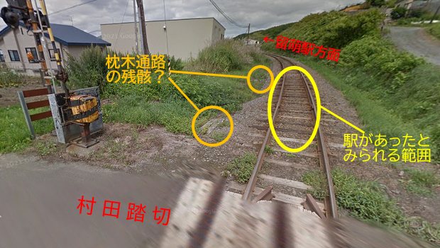 線路脇に通路として並べられた枕木は、駅の廃止後も撤去されなかったようで、廃止から20年の歳月を経た2014年時点でも、その一部がまだ残っていたのだ(これより後年に撮影されたものでは、もう確認できなくなっている)。 このことから、村田踏切の留萌駅寄りにある、上の画像で枕木通路の残骸が見られる範囲に、この駅があったと考えることにした。