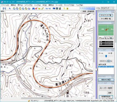ただし、ここで唯一悩ましかったのは、3箇所あるトンネルのうち、比較的長い上に線形が直線ではない「峠下トンネル」の存在だ。 航空写真に写されていない地下部分について、推測で曲線を描くこともできなくはないが、それだとただの創作に過ぎず精度もへったくれもなくなったしまうため、できれば何らかの根拠に基づいた線を引きたい。 そこで、このトンネル付近の地形図を「カシミール3D」に読み込ませ、「カシミール3D」に表示された線形をなぞる形でトンネル内の路線データを作成している。