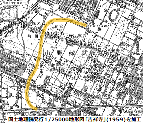 入手した1/25000地形図の「吉祥寺」(1959) は、支線が廃止された年の作成なので、廃止直前の状況が描かれているようだが、1/25000という縮尺にもかかわらず、やや古い年代のもののためか少々造りが粗いのは否めない。