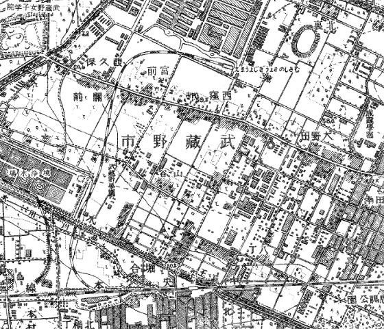 このエリアは公開されている中では最も古い1945-1950年の航空写真で見ることができるが、残念ながら逆に古すぎてこの支線の建設前らしく、線路や終点付近に誕生するはずの武蔵野グリーンパーク野球場はまだ影も形もない。