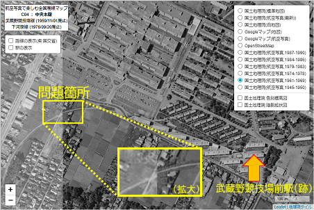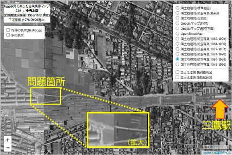 ご覧の皆様にも、ページ上部のマップで同じ場所を表示して(ある程度ズームを上げておくとより分かりやすい)、右上のボックスで航空写真の年代だけ変えてみる、ということをお試し頂きたいのだが、