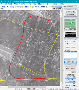 最後に、表示する航空写真を最新のものに切り替え、遺構や遊歩道が見られる箇所では最新の航空写真での位置に補正して、路線データを完成させている。