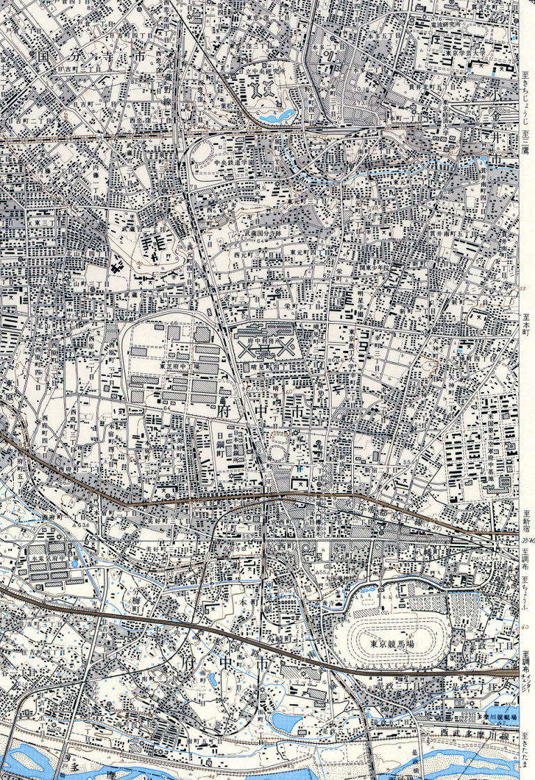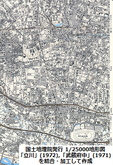 短い支線ながら1/25000の地形図では2つの図版にまたがって描かれており、それぞれ廃止前に出版された中では最も新しい図版を選んで、起点の国分寺側から順に「立川」(1972) と「武蔵府中」(1971) を入手した。